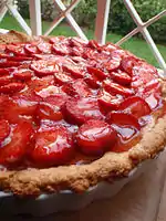 Strawberry pie | Consists of strawberries, sugar, a pie crust, and sometimes gelatin. Usually about 70% of the pie by weight may be strawberries. It is often served with whipped cream, or sometimes with ice cream.[5] | |