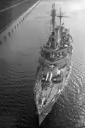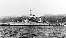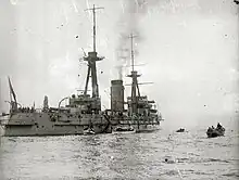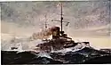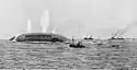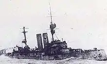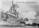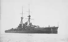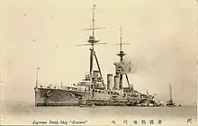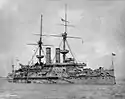 Much like battlecruisers, battleships typically sank with large loss of life if and when they were destroyed in battle. The first battleship to be sunk by gunfire alone,[4] the Russian battleship Oslyabya, sank with half of her crew at the Battle of Tsushima when the ship was pummeled by a seemingly endless stream of Japanese shells striking the ship repeatedly, killing crew with direct hits to several guns, the conning tower, and the water line or below it, which became the cause of the ship's sinking.[5][6] Battleships also proved to be very vulnerable to mines, as was evidenced in the Russo-Japanese War and both World Wars. After the Battle of Port Arthur,[7] a number of Russian and Japanese vessels were struck by mines and either sank or were scuttled to prevent their capture. A decade later, the Marine Nationale and Royal Navy lost three battleships, HMS Irresistible, HMS Ocean, and Bouvet, to Turkish mines in the waters of the Dardanelles. Torpedoes were also very capable of sinking battleships. On 21 November 1944, USS Sealion sank Kongō with over 1200 casualties.[8] HMS Barham was struck by three torpedoes fired from German submarine U-331.[lower-alpha 1] Barham could not make an attempt to dodge the incoming torpedoes and sank with 862 fatalities as a result of several magazine explosions that occurred after she had initially been hit by U-331's torpedoes.[11]