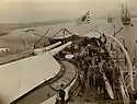 Although mines and torpedoes constantly threatened the battleship's dominance, it was the refinement of aerial technology and tactics that led to the replacement of the battleship with the aircraft carrier as the most important naval vessel. Initially, the large scale use of aircraft in naval combat was underrated and the idea that they could destroy battleships was dismissed. Still, the United States and the Japanese Empire experimented with offensive roles for aircraft carriers in their fleets.[12] One pioneer of aviation in a naval role was US Army General Billy Mitchell, who commandeered SMS Ostfriesland for testing of his theory in July 1921. Though these tests did not impress his contemporaries, they forced the US Navy to begin diverting some of its budget towards researching the matter further.[13] The belief that the aircraft carrier was junior to the battleship began to evaporate when the Imperial Japanese Navy, in a surprise attack, nearly destroyed the United States Pacific Fleet while it was at anchor at Pearl Harbor on 7 December 1941.[14] The captain of the Bismarck, Ernst Lindemann, had almost dodged the Royal Navy until he was undone by British reconnaissance aircraft. Although almost every sea battle in World War II involved gunfire between surface warships to some degree, their time as the senior ship of a nation's fleet had run its course.[15]
