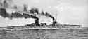 The term "battleship" first entered common parlance to describe certain types of ironclad warships in the 1880s,[1] now referred to as pre-dreadnoughts. The commissioning and putting to sea of HMS Dreadnought, in part inspired by the results of the Battle of Tsushima in May 1905,[2] marked the dawn of a new era in naval warfare and defining an entire generation of warships: the battleships. This first generation, known as the "Dreadnoughts", came to be built in rapid succession in Europe, the Americas, and Japan with ever more tension growing between the major naval powers. However, despite the enormous sums of money and resources dedicated to the construction and maintenance of the increasing number of battleships in the world, they typically saw little combat. With the exception of the naval battles of the Russo-Japanese War and Jutland, which would be one of the last large-scale battles between capital ships,[3] no decisive naval battles between battleships were fought. When the First World War ended in 1918, much of the German High Seas Fleet was escorted to Scapa Flow, where almost all of the fleet was scuttled to prevent its being divided amongst the victorious Allies. Numerous other battleships were scuttled for similar reasoning.