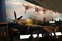 • Spitfire LF Mk.XVIe RR263. Built in 1944 and delivered to the RAF that year with 2nd Tactical Air Force. The Spitfire was loaned to Vickers Supermarine for experimental reasons in 1949 before moving to storage. Used as a static backdrop for the Reach for the Sky movie and later was on a plinth at RAF Kenley as TB597, codes GW-B. Later overhauled and repainted again as TB597 as GW-B before being put on display at Musée de l’air et de l’espace, Le Bourget.[56]