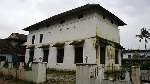 There are at least eight known synagogues in Kerala in recorded history, even though most of them are not operating anymore. Seven of the synagogues are used by the Cochin Jews, with one used by the Paradesi Jews.[1] Each of these is quite unique in its construction and architecture; nevertheless, they retain very similar aesthetics, blending in both the Jewish and Keralite traditions rarified over centuries.[2] A synagogue was called "Beit Knesset" (Malayalam: ബേത് ക്നേസേത്; Hebrew: בית כנסת) in Judeo-Malayalam or "Jootha Palli" (Malayalam: ജൂതപള്ളി) with joothan meaning Jew in Malayalam and -palli a suffix added to prayer houses of the Abrahamic faiths.