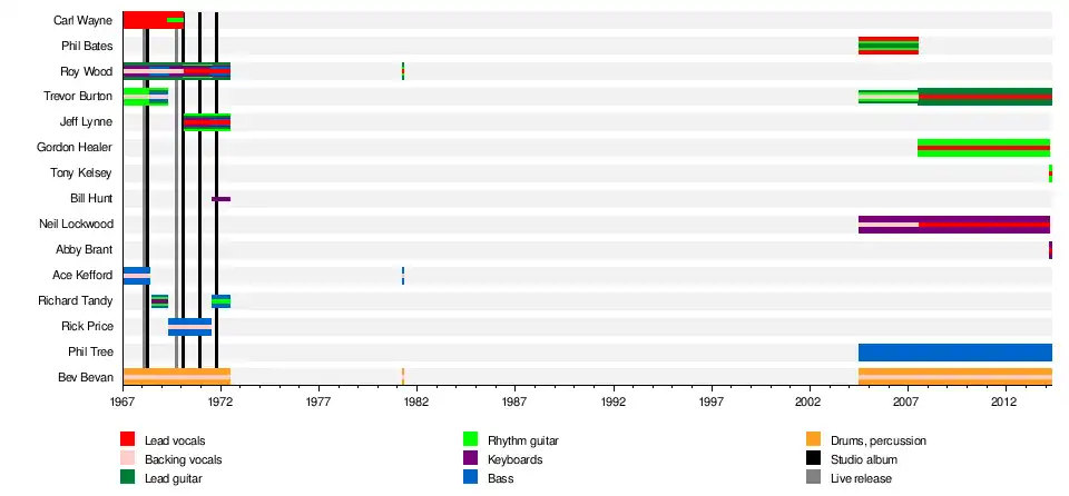 The Move evolved from several mid-1960s Birmingham based groups, including Carl Wayne & the Vikings, the Nightriders and the Mayfair Set. Their name referred to the move various members of these bands made to form the group.[2] Besides Wood, the Move's original five-piece roster in 1965 was drummer Bev Bevan, bassist Kefford, vocalist Carl Wayne and guitarist Trevor Burton.[2] The final line-up of 1972 was the trio of Wood, Bevan and Jeff Lynne; together, they rode the group's transition into the Electric Light Orchestra. Between 2007 and 2014, Burton and Bevan performed intermittently as "The Move featuring Bev Bevan and Trevor Burton."