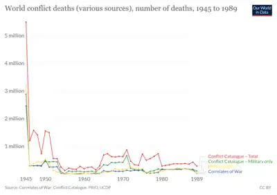 Graph of global conflict deaths from 1945 to 1989 from various sources.