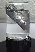 Lithium has a very low density (0.534 g/cm3), comparable with pine wood.[11] It is the least dense of all elements that are solids at room temperature; the next lightest solid element (potassium, at 0.862 g/cm3) is more than 60% denser. Apart from helium and hydrogen, as a solid it is less dense than any other element as a liquid, being only two-thirds as dense as liquid nitrogen (0.808 g/cm3).[12] Lithium can float on the lightest hydrocarbon oils and is one of only three metals that can float on water, the other two being sodium and potassium.
