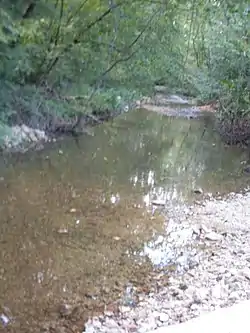 The stream headwaters arise in northwestern Douglas County on the east flank of Keyger Mountain just west of Missouri Route AK to the northwest of Arden and south of Dogwood and about nine miles west-northwest of Ava. The stream flows south to southwest through western Douglas County. It is bridged by Missouri Route T just east of Merritt and Route DD west of Cross Roads. The stream then enters the Mark Twain National Forest. In the southwest corner of Douglas County the stream meanders for a short span into and out of southeast Christian County, back into Douglas and immediately south into Taney County. In northern Taney County the stream runs parallel to Missouri Route 125 for about one mile before joining Beaver Creek just northeast of Bradleyville.[2] The stream source is at an elevation of approximately 1490 feet[3] and the elevation of the confluence is 814 feet.[1]