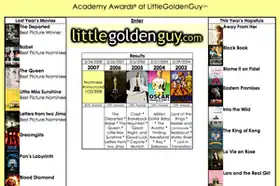 Little Golden Guy is a website which presents statistical data related to the Academy Awards (also known as the Oscars). Launched by Brian Barney in 1999,[1] the search engine provides a method of tabulating the films and individuals holding records for the most nominations and awards within a particular category or within a specified timeframe.[2] The website maintains data from the 1st Academy Awards ceremony, honoring films from 1927 and 1928, to the 84th Academy Awards ceremony, honoring films from 2011.[3] The site's search results also provide internal links to annual summaries, as well as statistical breakdowns of individual awards categories. The site has not been updated since the 2013 Academy Awards.