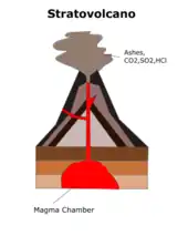Fig. 2 – shows the structure of a stratovolcano. Magma escapes from the magma chamber and forms different layers in different eruptions. The eruption also emits ashes and various gases.