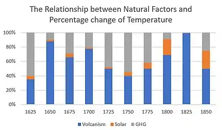 Scientists pointed out several natural causes of the Little Ice Age, e.g. volcanic activity, orbital cycles, decreased solar activity and Greenhouse gas. Gabriele C. Hegerl compared the different forcing of Little Ice Age based on various studies.[22] An energy balance model was simulated, with volcanic, solar and greenhouse gas signals as parameters. They created various models to calculate the correlation between natural forcing and temperature change. It showed natural forcing acted as an important role in temperature change (Fig. 5). Also, the research also compared the contribution of temperature change among three natural factors.[22] Volcanic activities was the main driver of the Little Ice Age (Fig. 7),[22] because volcanism was the largest forcing.