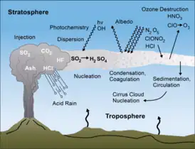 Three large cooling periods caused by volcanic eruptions in 1641–1642, 1667–1694 and 1809–1831 respectively.[2] Also, some major volcanic eruptions caused the fall of the temperature. During the Little Ice Age, all major volcanic eruptions were stratovolcano, also known as composite volcanos. They were built by the escape of magma through separate vents over thousands of years, accumulated into layers. A large amount of sulfate and volcanic ashes escaped from the volcano, resulting in a significant decrease in temperature.