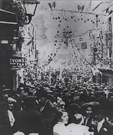 During the early 1800s a small wave of Northern Italians emigrated to the UK due to the Napoleonic wars and settled in the area because at the time it was a centre of craftsmanship. They would go on to start businesses showing the first Italian presence in the area. Later due to the Italian wars of unification in the mid to late 1800s a wave of immigration from Italy came into London and many settled in that area of Clerkenwell because the slums were affordable for the newly arrived immigrants. In 1842 an Italian Catholic free school was founded by a local Italian priest. The school was later taken over by St Peter's Italian Church and at its peak in around 1900 reached around 3,000 pupils due to the large number of Catholic Irish immigrants in other parts of Clerkenwell. The school would close its secondary school in 1960 and completely close in the 1980s.[9] In the 1840s Giuseppe Mazzini would live in London co-founding a working mans club and a non religious school.[10] Surveys in the 1880s discovered that Italian households had the worst conditions compared to other groups. They said “the drains so constantly stopped that they over flowed and the inhabitants had to place planks on stones so as to step from house to house without treading in sewage matter lying exposed in the open court.”. By this point the occupation of about half of the men in Little Italy was Ice Cream vendor and Italian immigration is generally credited to introducing Ice cream into the U.K.[11] In 1863 St Peter's Italian Catholic Church would open giving the community a place to observe their faith in their original language and in 1878 the community opened the oldest delicatessen in the U.K. (L. Terroni & Sons).[12] Giovanni Ortelli, a wealthy businessman, identified the need for an Italian-speaking hospital for the first- and second-generation Italians in the area. He raised funds for the hospital, and it was built in 1884 in Queen Square. It was primarily Italian speaking and was free as it ran on donations.[13] Later in 1895 the Italian Consul published a report estimating Italians in London numbered around 12,000, with southern Italians traditionally making their home in Little Italy while those from northern Italy were establishing a newer base in Soho.[14] Around this time the Italian Church would start doing the Procession in honour of Our Lady of Mount Carmel. This was a huge event for the local Italians who would hang flowers and flags across the streets and play music and dance late into the night. On some occasions people would even do the Tarantella (a traditional Italian dance).[15]