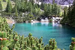 Little Lake Liqenat or Lake Drelaj (Albanian: Liqeni i Drelajve or Leqinati i vogël; Serbian: Језеро Мали Лићенат / Jezero Mali Lićenat) is a small lake found on Mount Leqinat that reaches an elevation of 2,341 m (7,680 ft) in the Accursed Mountains range in western Kosovo, near the border with Montenegro. The length of this lake is 100 m (328 ft) and the maximum width is 40 m (131 ft). Little Lake Liqenat at a lower elevation than the much larger Lake Liqenat found in the west of it and only a hill of pine trees separates the two.