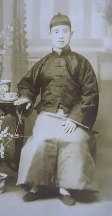 Around 1923, Liu Wanchuan moved to Beijing to make a living and took up advanced studies with Yin Fu's son Yin Yuzhang. He studied with him for eight years.[1] From the early 1930s onward Liu worked as an accountant for a restaurant called YuChun Lou (Jade Spring Restaurant) that was owned by Li Shao'an (1888-1980) (also known as Li MengRui). Li Shao'an was from the same village as Liu,[4] and had studied with Li Wenbiao, Yin Yuzhang, Liu Bin, and Liang Zhenpu, to whom he became a formal disciple.[5] Li Shao'an was known for his extraordinary skill in daishou (dragging palm) and was thus given the nickname, "Iron Arm Li."[4]