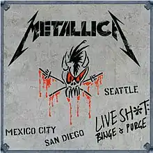 Live Shit: Binge & Purge is the first live album by the American heavy metal band Metallica, released in a box set format on November 23, 1993. The initial first pressings contained three CDs or cassette tapes, with songs from concerts in Mexico City on the Nowhere Else to Roam tour, as well as three VHS tapes while a newer version contains two DVDs from concerts in San Diego on the Wherever We May Roam Tour and Seattle on the Damaged Justice Tour. It was originally released as a cardboard box depicting the style of a typical tour equipment transport box. Besides the audio and video media, the box featured additional bonus material (booklet showing photos, typical tour correspondence as sent and received by the band and their management, and internal documents and handwritten notes; a recreated copy of an access pass to the "Snakepit" part of the tour stage; a cardboard drawing/airbrush stencil for the "Scary Guy" logo) and a black "Metalli'Fukin'ca" T-shirt. Live Shit: Binge & Purge has been certified 15× platinum by the RIAA as a long-form video format.