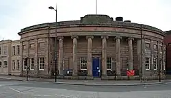 The building is constructed in stone, and presents a curved façade to Mount Pleasant and Hope Street. Its architectural style is Greek Revival. It has 16 bays. The lateral three bays on each side are recessed and have two storeys; the rest of the building is single-storied. The central seven bays form a recessed entrance behind six unfluted Ionic columns. Elsewhere the bays are divided by pilasters. The windows are sash windows. Along the top of the building is a cornice.[7] Inside is a central hall, a lecture theatre, a library, a museum, and meeting rooms, all lit from above by glazed domes.[3]