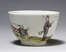 Richard Chaffers made soapstone-type porcelain featuring mainly Oriental designs at Shaw's Brow. An advertisement for it in 1756 provides the earliest documentation of Liverpool porcelain production, which he continued until his death in 1765. In 1756 he also held a licence to mine soapstone at a site in Cornwall.[1] The porcelain resembles Worcester porcelain. Most of the plates made by the factory are octagonal, and some tea and coffee sets are six-sided. A common product was a bulbous mug with an incised cordon above the foot, enamelled with a Chinese scene in polychrome. Philip Christian & Co took over the factory when Richard Chaffers died and produced similar designs until 1778.