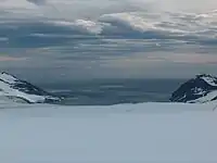 The principal mountain formations on the island comprise Tangra Mountains (32 kilometres or 20 miles long and 8.5 kilometres or 5.3 miles wide, with Mt Friesland rising to 1,700.2 m or 5,578 ft[10][11]), Bowles Ridge (6.5 km or 4 mi long, elevation 822 m or 2,697 ft), Vidin Heights (8 km or 5 mi, 604 m or 1,982 ft), Burdick Ridge (773 m or 2,536 ft), Melnik Ridge (696 m or 2,283 ft) and Pliska Ridge (667 m or 2,188 ft) in the eastern part of the island, and Oryahovo Heights (6 km or 4 mi, 340 m or 1,115 ft), and Dospey Heights (6 km or 4 mi, 265 m or 869 ft).[2] The local ice relief is prone to change; in December 2016 the elevations of Mount Friesland and St. Boris Peak were 1,693 m (5,554 ft) and 1,699 m (5,574 ft) respectively, making the latter the summit of Livingston in that season.[12] According to the American high accuracy Reference Elevation Model of Antarctica (REMA), Mount Friesland is 8 m (26 ft) higher than St. Boris Peak.[13]
