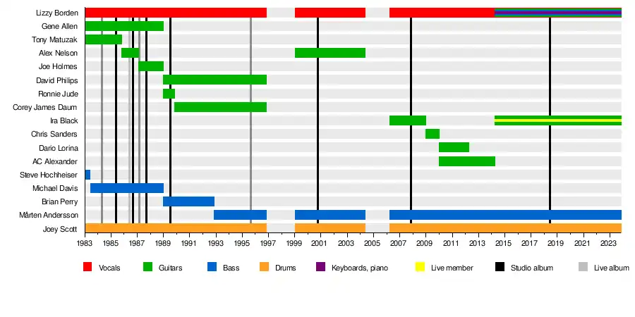 Lizzy Borden is an American heavy metal band formed in Los Angeles in 1983. To date, the band has charted on the Billboard 200 four times.[1] Lizzy Borden is eponymous of the band's lead vocalist.