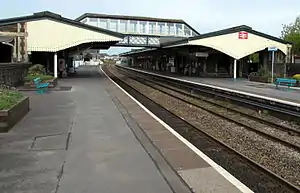 Llanelli railway station is the railway station serving the town of Llanelli, Carmarthenshire, Wales. It is located on the West Wales line and the Heart of Wales line 225 miles 20 chains (362.5 km) from the zero point at London Paddington, measured via Stroud.[1] The station and the majority of trains calling are operated by Transport for Wales.
