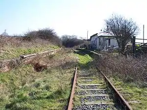 Llangwyllog railway station was situated on the Anglesey Central Railway line from Gaerwen to Amlwch. The single storey station building with ticket and waiting room was located on the Down (west) side and opened in 1865, the platform being extended in 1890. A small goods shed was located north of the main building.[2] In 1914 a passing loop was installed at the station, the only one of the whole Anglesey Central line. Another platform was also installed in the year on the opposite side of the line which had a wooden shelter on it.[3]