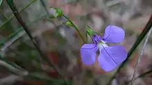 Lobelia anceps, commonly known as trailing lobelia,[2] is a small herbaceous, flowering plant in the family Campanulaceae. It has dark blue or purple flowers and grows in New South Wales and Queensland.