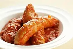 The Lokerse paardenworst (Lokeren horse sausage) is a regional product from the Belgian city of Lokeren.[1] The dish consists of minced horse sausage in a sauce of tomato purée or peeled tomatoes, onion and celery, herbs (bay leaf, pepper and salt), butter or oil.[2][3]