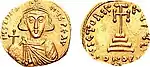 The earliest coins that can definitely be attributed are those of Gisulf I,[9] who was duke from 689 to 706. These coins were also imitations of imperial coins, copies of those of Tiberius III (698-704) and Justinian II (second reign, 704-711). Under Gisulf the types used were two. In the first[12] the obverse depicted the emperor with armor, spear and shield, the reverse a cross potent on a base; this coin was copied from a coin of Tiberius III.[13][14] In the second type[15] the emperor's bust is depicted with the loros;[16] in one hand he holds a cross potent and in the other a globus cruciger, the cross of which is also enhanced; on the globe is the legend PAX. The reverse of this coin depicted the bust of Christ from the front. The model was a solidus of Justinian II, issued during his second reign.[17][18] These two types were used exclusively under Gisulf I.