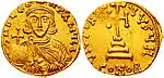 Beginning with the rise of Romuald II a third type was introduced, with the bust of the emperor holding the globus cruciger on the obverse.[19] This type imitated coins issued under the early reign of Justinian II[20] and was used in the coinage of Benevento until the middle of the reign of Godescalc (c. 740).[9] The inscriptions used were those of Justinian's coins. According to Grierson and Blackburn the type was probably chosen because of the familiarity of the Benevento Lombards with this type, which was used by many emperors during the 7th century.[9]
