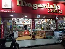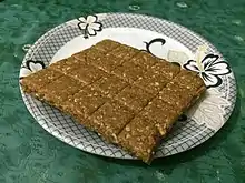 Lonavala chikki is an Indian sweet named after Lonavala, a town in Pune district of Maharashtra India.[1] It is a type of chikki or guddani, a confection made from jaggery, ground nuts and ghee. The product was sold by Maganlal Agarwal from his sweet meat shop in Lonavala, and packaged by railway authorities and sold to train travellers between Lonavala and Mumbai. Encouraged by this, Agarwal renamed the product "Maganlal chikki", and it later became and continues to be called Lonavala chikki.[2][3][4]