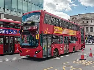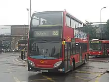 A large number of operators were involved in providing replacement services, which operated every 15 minutes instead of every 10 as had been run prior to London Easylink's collapse. London Central and London General provided low-floor Volvo B7TL double-deckers amongst older vehicles, and fellow Go-Ahead Group subsidiary Metrobus also contributed. Independent operators Amber Lee, Carousel Buses, Imperial Buses, Redroute Buses and Sullivan Buses all provided vehicles made spare during the break in school terms; none had previously operated a Transport for London contracted route. Arriva London's tourist division The Original London Sightseeing Tour operated the route using closed-top MCW Metrobuses.[3] After a month of service, First London and TfL subsidiary East Thames Buses joined the operation, while Stagecoach London operated additional journeys on route 53, which parallels the 185 over the southern section of route.[4]