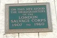 Memorial plaque on the side of the Salvage Corps headquarters, Watling Street, London.
