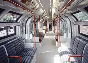 ![]() Inside the Red 1986 prototype London Underground train when on public display at Woodford station. | |