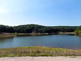 There are driving routes that provide views of the elk and bison, often at close proximity. The park is also home to many deer, wild turkey and waterfowl.[2] Domestic animals are not permitted whatsoever, even if confined to a vehicle. Research was conducted in 2016 to determine if a sinkhole was under the lake. The boat dock has been removed. Fishing was closed in 2017 in an effort to rebuild the fish population.
