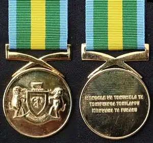 The Long Service Medal, Gold is silver-gilt medallion, 38 millimetres in diameter, depicting the Coat of Arms of the Republic of Venda.[7][8]