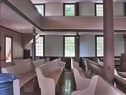 The Long Society Meetinghouse is located in western Preston, on the north side of Long Society Road, surrounded by a small cemetery. It is a two-story wood-frame structure, with a side gable roof and clapboarded exterior. Its main facade is three bays wide, with the entrance at the center, sheltered by a late 19th-century enclosed vestibule. The vestibule has a gabled roof, and applied Stick style woodwork. The side walls are also three bays wide, with windows in each of the bays. The rear wall has only a single window, that for the pulpit, which is placed high in the center of the facade. The interior has a small entry area, from which stairs lead to the left and right to the gallery. The gallery extends around three sides of the interior, supported by columns with turned capitals. The open downstairs of the sanctuary is filled with simple bench pews.[2]