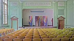 That 1917 expansion is the north section of the current building. It was designed by James R. Law with a gym in the basement and classrooms above.[3] A matching section with a 2-story auditorium and lunch room was added in 1924, designed by James and Edward Law. In 1938 the 1892 building was torn down and replaced by a section with a larger gymnasium, library and music room designed by the Laws and Ellis Potter and built as a Public Works Administration project. In 1940, the 1909 building was torn down, leaving the structure that stands today. It has a reverse L-shaped footprint and is about 275 feet (84 m) wide in its main facade, running north–south, and about 60 feet (18 m) on the north end and 105 feet (32 m) deep on the south end. It is built of load-bearing red brick walls in running stretcher bond in the original 1917 section, and with structural clay tile with brick veneer in the 1924 and 1938 sections.[2]