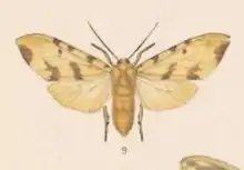 Primaries pale brownish yellow, with a small orange coloured spot close to the base, three large spots along the costal margin, a large elongated patch on the outer margin, and two rather broad streaks on the inner margin partly crossing the wing towards the middle, all pale brown. Secondaries pale yellowish white, partly hyaline (glass like) near the base. The underside of the primaries as above, but with all the markings more indistinct. The head and thorax the same colour as the primaries; the abdomen above orange, the anus and the underside whitish; the legs and antennas orange brown. Wingspan 2+14 inches (57 mm).[2]