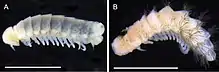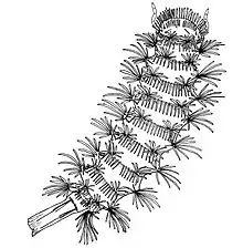 Lophoproctids are distinguished by a soft body, bearing bristles at the posterior end of each diplosegment;[2] they are blind and generally lack pigmentation. Individuals are small, ranging in size from 1.2 to 4.2 mm.[3] Adults have 13 pairs of legs with internal leg buds,[4] except for those in one species (Lophoturus madecassus), which have only 11 pairs of legs.[5]