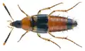 Lordithon lunulatus is a rove beetle. It is a common insect in Europe.[2] The mature adult is about 5 millimetres long. It has distinctively patterned elytra – these are shiny black with pale patches at the outer front corners, and a pale margin at the rear. The thorax is broader at the rear, narrower at the front, shining and reddish brown. The head is long and shiny. The abdomen is largely reddish-brown, but the two rear segments are black. It is covered is pale hairs, and has black setae on its lateral margins. The legs are yellow, and the tarsi are elongated, with five segments on each. The antennae have eleven segments – the first to the fourth and the last are yellow; the others are black.