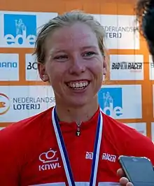 Lorena Wiebes (born 17 March 1999) is a Dutch racing cyclist, who currently rides for UCI Women's WorldTeam SD Worx.[4] She rode for Parkhotel Valkenburg in the women's team time trial event at the 2018 UCI Road World Championships.[5] She won the gold medal in road cycling at the 2019 European Games, beating her compatriot Marianne Vos in the sprint for the line.[6] In May 2022, Wiebes won all three stages of the RideLondon Classique.[7] In July 2022, she won the first stage of the Tour de France Femmes.[8]