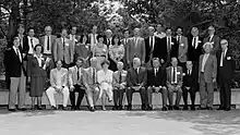 Lorraine Eden (in the middle) poses for a photograph with Carl Shoup at a conference organized in his honor in Ottawa, Ontario, Canada in 1989. Joining them to the right of Carl Shoup is William Vickrey; Richard Musgrave is second from the right in the front row; Peggy Musgrave is second from the left in the front row.[17]