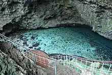 The site was created centuries ago as a result of tectonic fractures when caves collapsed, forming a bowl-shaped depression which subsequently filled with water.[3] Initially, the cave was used by the indigenous Taíno Indians for religious rituals and fertility rites. The Taíno were the first inhabitants of the Hispaniola island. The three lakes are called "Lago de Azufre" (discovered in 1916), "La Nevera" and "El Lago de las Damas".[4] Some of the lakes also have openings on the outside.[5] A staircase cut into the rock gives access to the first cave. A boat pulls visitors across the second lake to give access to a fourth lake called "Los Zaramagullones," not considered one of the three "eyes" or main lakes since it has an opening to the outside.