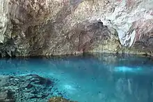 The caves are fed by water from an underground river and surrounded by stalactites and stalagmites.[6] The composition of the water varies. Early explorers thought that the first pond was made up of sulphurous water because of its blue hue.[7] However, after testing it was discovered that Lago Azufre is actually composed of calcium minerals.[8]