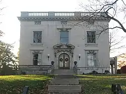Louis Levey Mansion, also known as the Pilgrim Life Insurance Company Building, is a historic home located at Indianapolis, Indiana. It was built in 1905, and is a two-story, Italian Renaissance style limestone dwelling consisting of a three bay by four bay main block with a one bay by two bay rear block. It has a semicircular bay on the rear facade. The front facade features a round arched entrance flanked by pilasters and the roof is ringed by a balustrade. The house was converted for commercial uses in the 1950s.[2]: 2–3, 6