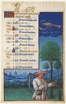 The standard arrangement of a book of hours, though somewhat variable, allows the sequence of the original volume to be reconstructed with some confidence, helped by the texts at the bottom and versos of miniature pages.[13] The calendar, showing the astrological sign of the Zodiac for the month, and the appropriate one of the Labours of the Months, would have followed the portrait opening. Each month has the recto and verso of a single folio. Every day has a saint's feast day named, alternating in red and blue ink, with the most important in gold. In the four months currently known, February shows a middle-aged man about to dine in "bourgeois comfort", June a haymaker with a scythe, and a whetstone in his belt, August a worker winnowing grain in a barn, and September a man treading grapes for winemaking.[14]
