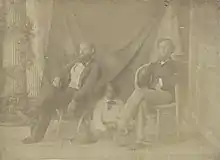 In the same month of 1858 that the earliest exclusively photographic exhibition was held in Australia was mounted at the Sydney Philosophical Society,[18] How made portraits of her guests on Christmas Day and Boxing Day at Woodlands. She set up a makeshift studio on her verandah,[19] using furniture, drapes and props including a stereoscope and stereo cards,[20] so as to shorten exposure conditions with brighter lighting, but make it appear that the pictures were made indoors.[21] The resultant prints are amongst forty-eight salted paper prints from the period October 1857 to January 1859 in her only surviving album,[22] carefully titled and signed, which is now held in the National Gallery of Australia, Canberra.[23]