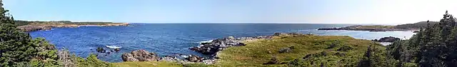 The first part of the trail is suitable for visitors of all skill levels.[2] It begins at the parking area at Lighthouse Point and follows the ocean coast to the east as a 2 kilometres (1 mi) hard-packed gravel partial loop trail. Along this part of the trail are a number of interpretive panels explaining the area's historical significance and natural features including its geography, flora and fauna.[2] There are benches to rest along the trail, as well as lookoffs in strategic places. Sections of the trail, where it passes over a fen and other wet ground are constructed as an elevated wooden boardwalk.[3] The trail is accessible to power wheelchairs and children in strollers and wide enough for two to walk abreast.[4][5] Pets are permitted on the trail but must be leashed and managed by their owners.[6] There are a number of small side paths branching off along this part of the trail, such as the one that gives access to the top of Lighthouse Cliff for an expansive view.[3] The trail follows the coast past Lighthouse Cove, Crows Roost, Morningstar Cove and continues to Western Gun Landing Cove Head where it loops back around toward the start.