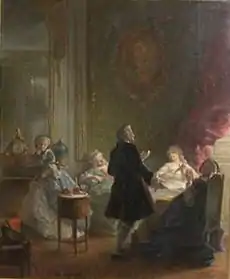 On 9 October 1749, Jacques-Armand Dupin married Louise-Alexandrine-Julie de Rochechouart-Pontville at the Church of Saint-Sulpice, Paris.[21] But for Louise and her husband, their son continued to be the source of trouble, especially when he ran up large debts from gambling. His father had to sell many of his assets in 1750 to honor the debts of his son.[22] The troubles with Jacques-Armand, however, continued. Claude Dupin was forced to obtain a Lettre de cachet, which led to Jacques-Armand being imprisoned in the fortress of Pierre Encise under the pretext of madness. After this, the family decided to send him to the Île Maurice on 26 October 1765, where he remained for the next two years until his death on 3 May 1767, a victim of yellow fever. Before embarking on the Count of Artois, a merchant ship of the French East India Company, Jacques-Armand reportedly revealed to his mother the existence of an illegitimate daughter of his, called Marie-Thérèse Adam,[lower-alpha 1] whose origins, however, remained mysterious. Nevertheless, Louise Dupin took care of the child and raised her as her own, later making Marie-Thérèse her reader[28] and heiress. Louise considered Marie-Thérèse as her own daughter and raised her after her own image, educatiing her in high culture and manners. Marie-Thérèse Adam seemed to have been entirely dedicated to Louise Dupin and remained at her side until Louise Dupin's death.