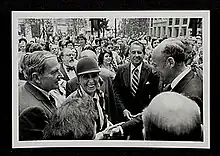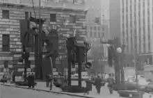 On 14 April 1977, the site, then known as Legion Memorial Square, was initially dedicated by Mayor Abraham Beame who "hailed Nevelson's sculpture as an antidote to a spate of recent violence in the city".[11]:54[14] In 1978, the space designed by Nevelson was renamed Louise Nevelson Plaza in a dedication ceremony presided over by Mayor Ed Koch and business magnate David Rockefeller,[11]:54 becoming the city's first public space to be named after and designed by a living artist.[2]:90 According to scholar Richard Lacayo, the largest one of the seven sculptures installed in the plaza, standing 70 feet tall, "unfurls majestically against the heavy stone of the Florentine-style Federal Reserve Bank across the street".[15] Writing for Time in 1981, art critic Robert Hughes described the works in the plaza as "big, imposing and mannered".[16]:8 In December 1978, Nevelson dedicated another public sculpture in the Lower Manhattan titled Sky Gate, New York, which was installed in the mezzanine lobby of 1 World Trade Center on the opposite site of the Financial District.[17]