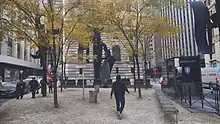 Louise Nevelson Plaza in 2021, showing the Federal Reserve Police booth on the right-hand side